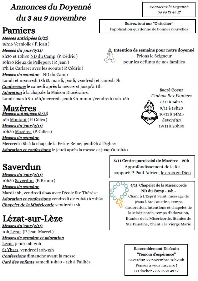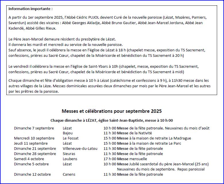 - L’Abbé Georges Akladje Komi est nommé vicaire de l’ensemble pastoral du Doyenné de Pamiers (Paroisses de Lézat-sur-Lèze, Mazères, Pamiers et Saverdun), en résidence à Pamiers.