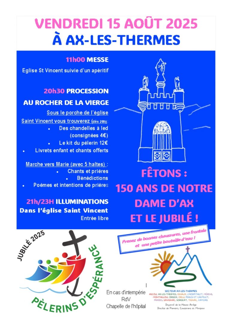 Nous avons hâte de vous retrouver vendredi 15 août pour fêter le Jubilé de l’Espérance et les 150 ans de la chapelle de Notre Dame d’Ax, à très vite !