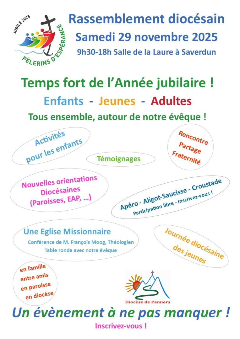 Le Samedi 29 novembre de 9h30 à 18h, notre évêque, Mgr Benoit Gschwind, nous invite à vivre une Journée jubilaire diocésaine. Enfants, jeunes et moins jeunes, en famille, célibataires, baptisés, catéchumènes, chercheurs de Dieu, des plaines et vallées de toute l’Ariège, nous avons tous rendez-vous à Saverdun à la Salle de la Laure.