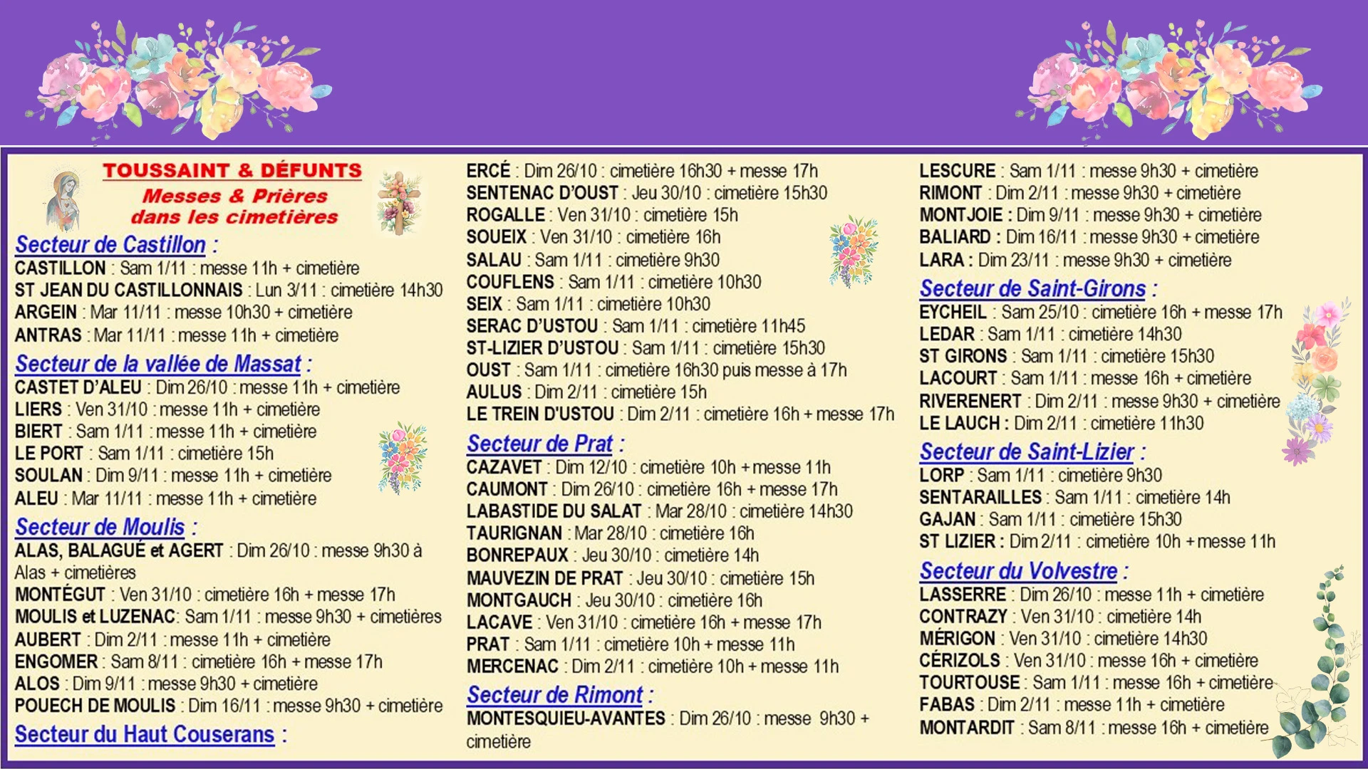 | Samedi 4 | 18h00 | Ourjout et St-Lizier |
